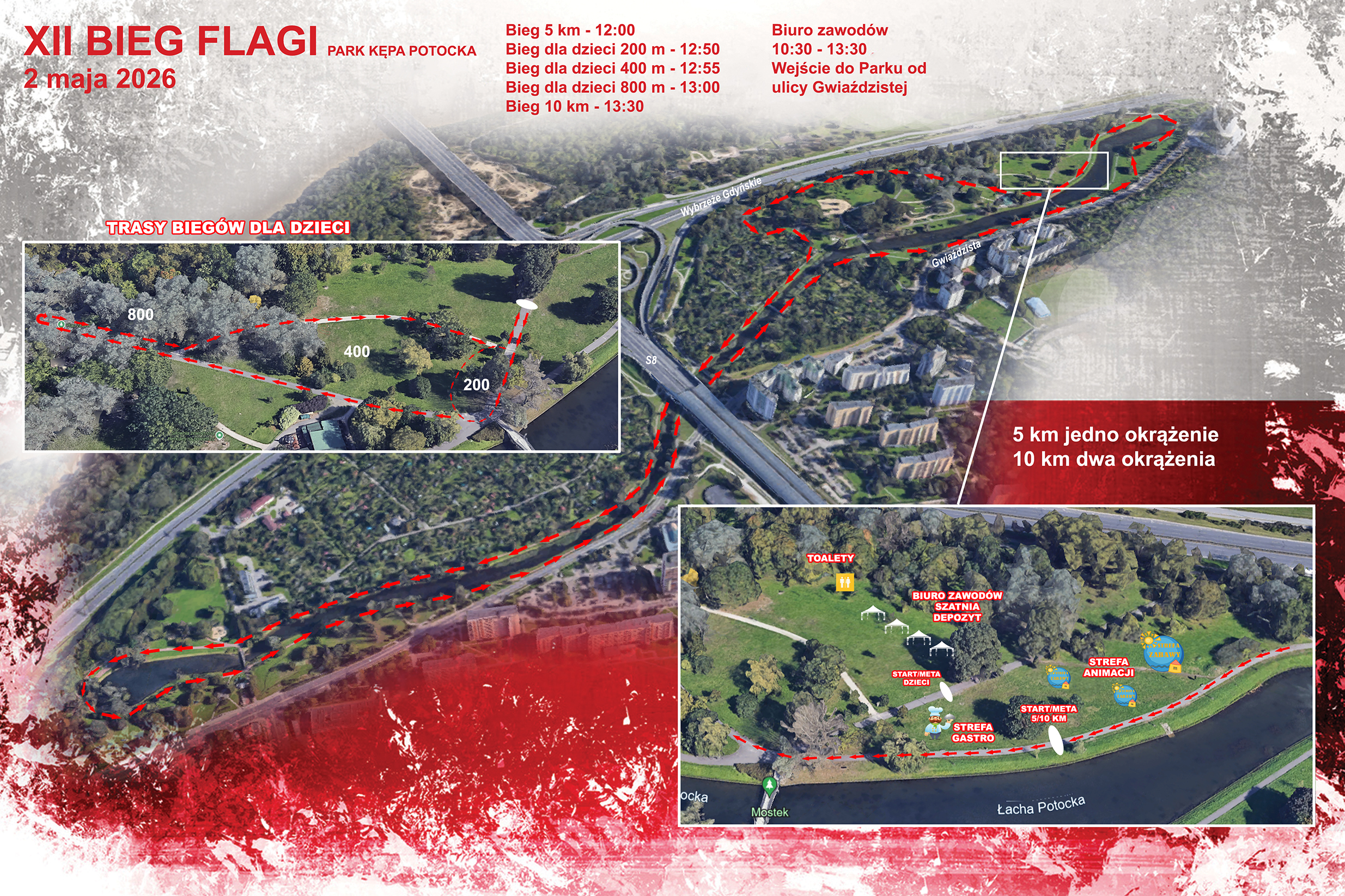 Trasa biegu dla dzieci na dystansie 200, 400 i 800 metrów będzie wyznaczona w centralnej części parku w pobliżu miejsca startu i mety biegu głównego.